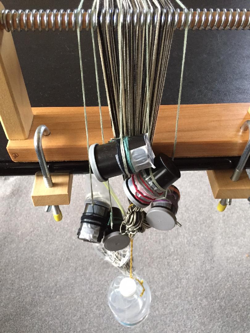 It is rarely necessary to weight each card separately. In the last example the black/white warp is woven in the double-face technique and has no twist buildup. Therefore a simple heavy weight (water bottle) can be used for all cards. A bag of pebbles would work as well. There are five cards with green warp threads are turned in the same direction for the full length of the piece. They are weighted individually using film canisters of 30g.