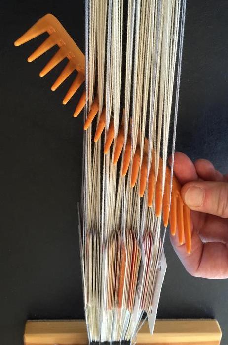 If a portion of the warp is tied up as a big bundle it can be tedious to spread it out. Here comes help in form of a beauty comb.